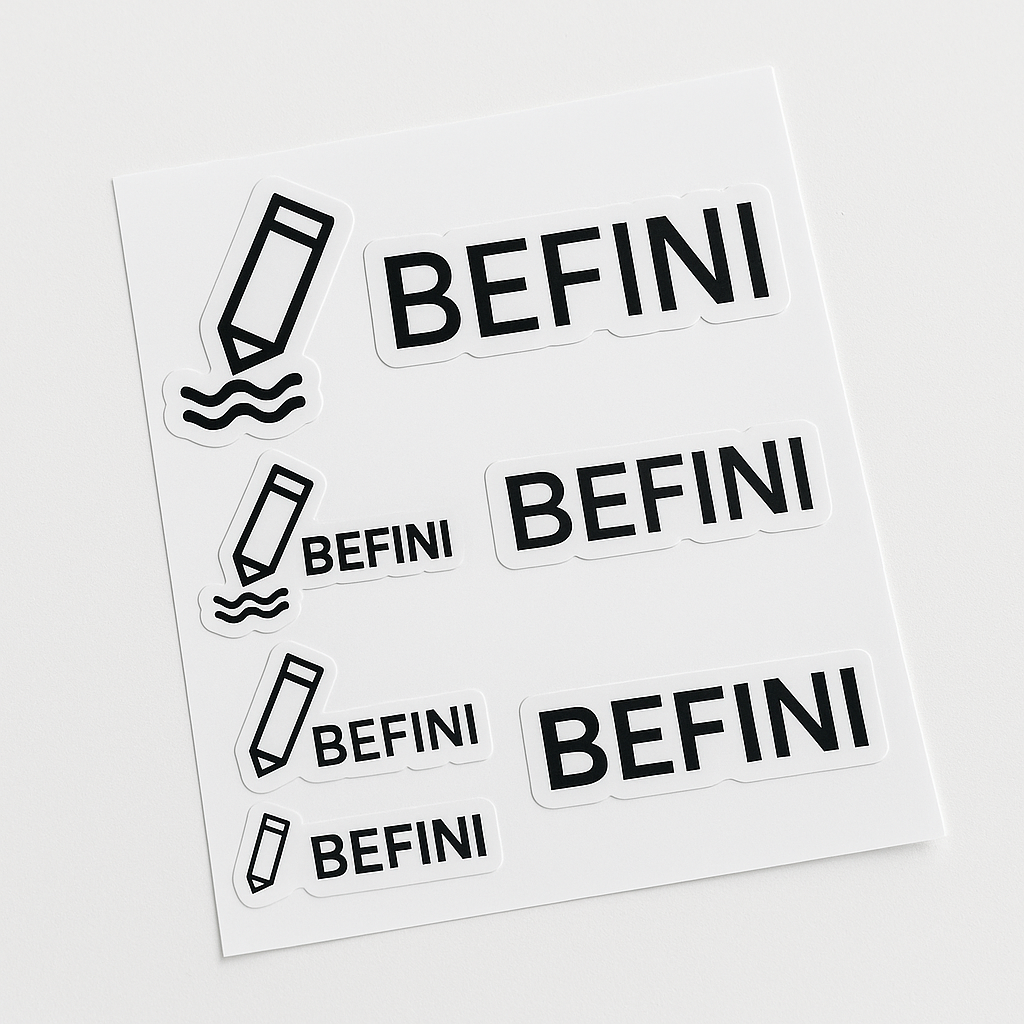 A stylish sheet of die-cut BEFINI stickers in various sizes and orientations. Printed on high-quality vinyl with a glossy finish, these durable stickers are ideal for laptops, notebooks, and other personal items.
